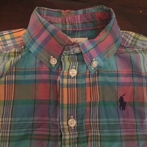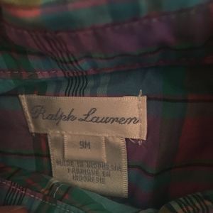 This Ralph Lauren shirt is a plaid, short sleeve, button-up that is size 9 months. It's in like-new condition.