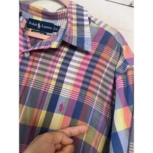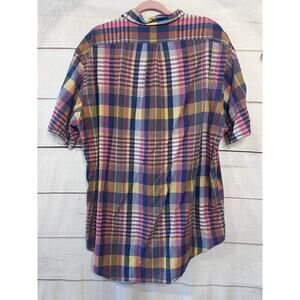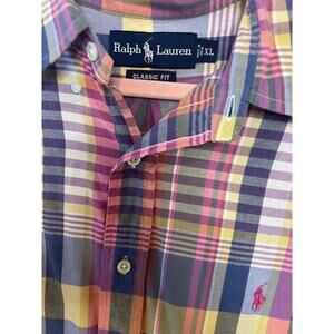 The product is a Ralph Lauren Plaid Short Sleeve Button Up shirt in size XL. It features a classic collared neckline, short sleeves, and a button-down closure. Made of cotton, this multicolor shirt is machine washable and suitable for casual occasions. The shirt is from the Lauren Ralph Lauren brand and is not vintage. Ideal for all seasons, this button-up shirt is a versatile addition to any man's wardrobe.