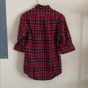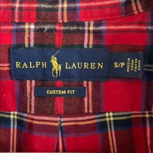 Ralph Lauren button up shirt. Plaid pattern in red and green. Shirt has been worn but is in very good condition with no stains or tears. I believe shirt is 100% cotton.