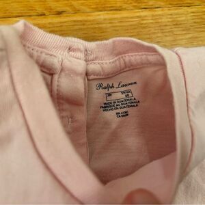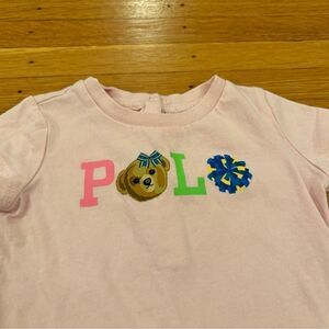 Ralph Lauren Polo Bear Cheer Cheerleading light pink short sleeve tee shirt. 3 buttons in back. 100% cotton. Size 3 months. Good condition.
