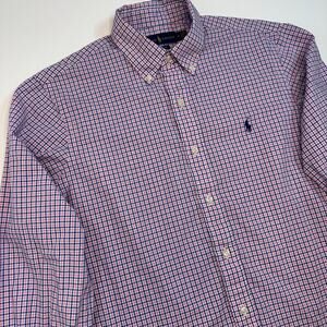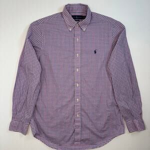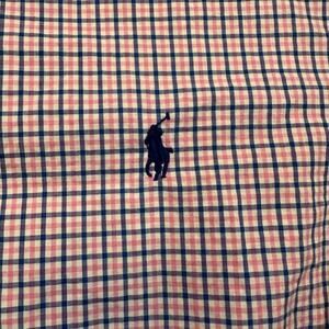 Ralph Lauren Polo Button Front Plaid Classic Fit Dress Shirt. Button down collar. 100% cotton. Navy and medium pink plaid. Embroidered polo logo. Mens size Medium. Good used condition.