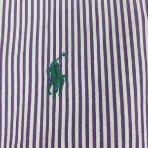 This Ralph Lauren Polo Curham shirt is a perfect addition to any man's wardrobe. With its classic fit, it will provide a comfortable and stylish look for any occasion. The shirt features a purple striped pattern, button-down collar, and short sleeves.