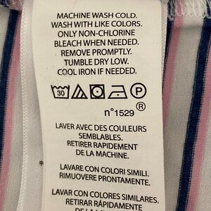 Classic Polo Golf Ralph Lauren short sleeve polo in the soft stretch lisle knit. White base with navy and light pink micro stripes. Four button placket, rib knit collar, and a chest pocket. Made in Peru. Fabric tag reads 92 percent cotton and 8 percent elastane for a smooth hand and comfortable stretch.