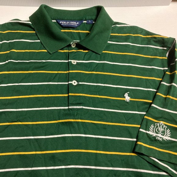 Ralph Lauren Polo Green & White + Yellow Striped Men's Golf Shirt Size Large, 100% Pima Cotton, made in Peru. Light weight. Excellent condition with no flaws. Westwood Country Club logo on sleeve (located in Vienna, Virginia near Tyson 's Corner outside Washington, D.C.) 32 inches in length from collar to bottom of shirt tail, 24 inches in width under arm from left hem to right hem. Photos may indicate wrinkles in shirt because it is cotton and has not been pressed.