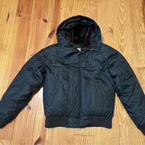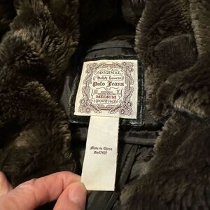 Ralph Lauren Polo Jeans Brown Puffer Down Coat, Medium. Faux fur interior lined hood. The hood itself is not detachable. Zip up coat with toggle buttoned flap. Left sleeve with exterior pocket design.
