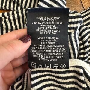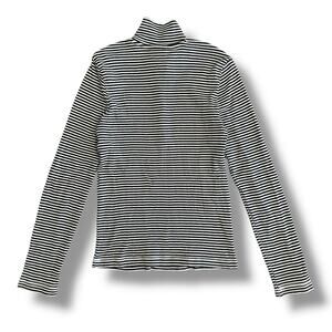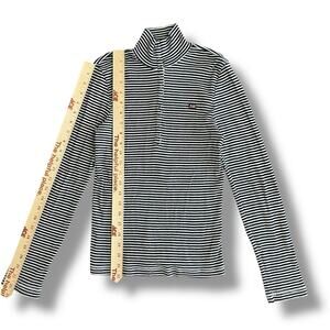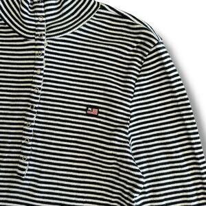 Polo Jeans Co. Ralph Lauren striped top blends sporty and classic style. Featuring a ribbed 100% cotton knit with bold black-and-white stripes, this long sleeve top is designed with a mock neck / turtleneck and half snap placket for versatile styling. The chest is accented with the iconic RL flag patch logo.