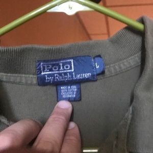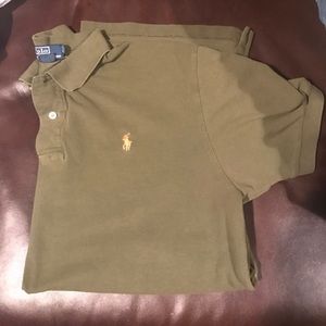 This Ralph Lauren Polo shirt has been worn no more than 5 times since I purchased it. In really good condition. The picture colors look a little deceiving from pic to pic. The color of the shirt is a hunter green type color with an orange Polo emblem on the front left part of the chest.