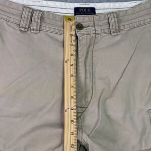 Classic Polo Ralph Lauren mens cargo shorts in beige/khaki color, size 38. Features multiple button-flap cargo pockets, front slash pockets, and back pockets for plenty of storage. Durable cotton construction, versatile for casual wear, outdoor activities, or summer outings. Timeless Polo quality and style.