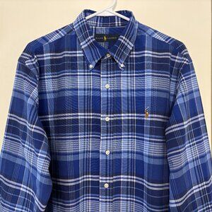 A gorgeous blue plaid button-front oxford shirt from Ralph Lauren that is in EXCELLENT condition - please see photos! Size is a men's XL. Material is 100% cotton. Ralph Lauren's signature polo horse is embroidered on the left chest.