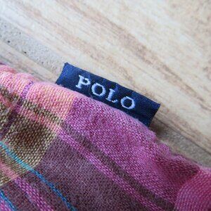 Ralph Lauren Polo reversible blouse. Two shirts in one! One side is pink and yellow plaid; the other side is pink checkered. Front snap closure on each side. Elbow length sleeves with optional roll-tab closure on the pink checkered side. (The roll-tab is attached with snaps and can be removed.) There is no fabric care tag but the shirt feels like cotton. The material does not stretch. The plaid color is slightly visible through the pink checkered side. Size S, however it runs small and I feel like it fits more like a size XS. (I wear a Small and the sleeves are a bit snug on me.)