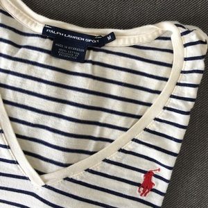 Ralph Lauren Polo T-Shirt. Navy/white stripes w/ red trademark. Size M but fits like a size S. 100 % cotton.