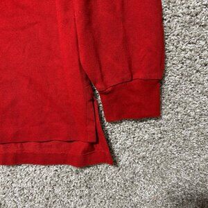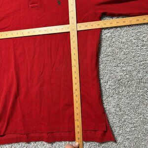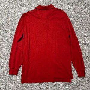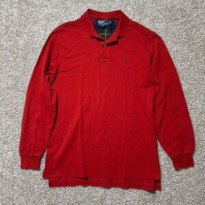 This classic Ralph Lauren long sleeve polo shirt features a bold red design, green logo embroidery, and a plaid inner collar detail. Crafted for style and comfort, it's a versatile wardrobe staple.