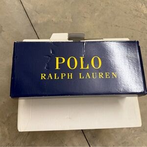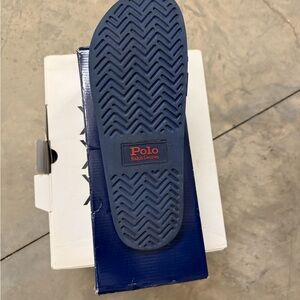 EVA footbed. "Polo" printed across the top, textured EVA outsole. Red and blue colors, size