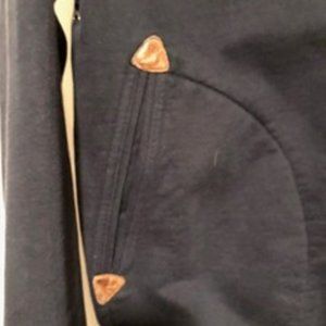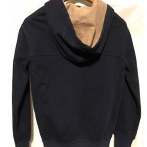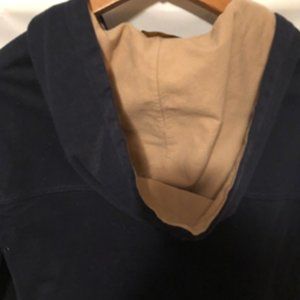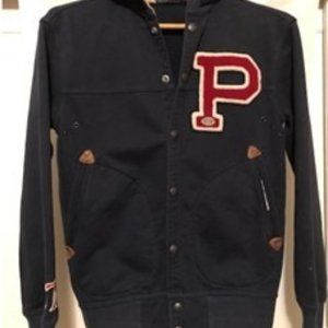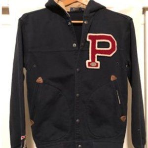 Ralph Lauren Polo Hooded Varsity Letterman's Jacket in perfect condition. Size women's extra small. Fabric cotton twill with metal buttons. Pockets reinforced with leather triangles.
