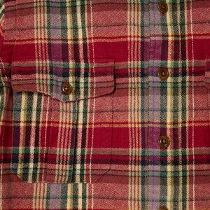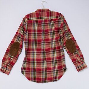 Polo Ralph Lauren plaid flannel shirt with elbow patches, pockets on chest, extra buttons sewn in