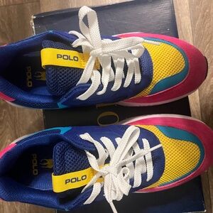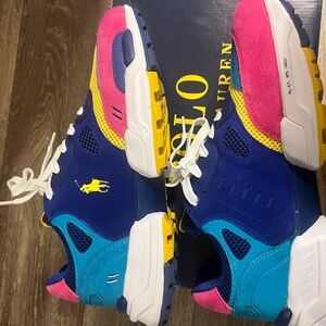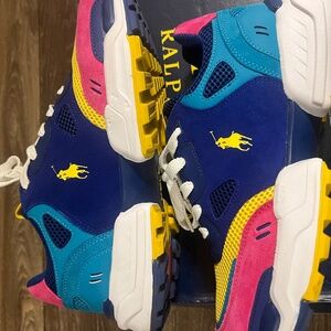 Pink, yellow, blue and turquoise, Ralph Lauren sneakers. 10.5 in mean 12 in women