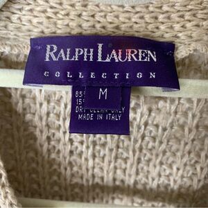 Color is a beige/tan. Ralph Lauren Collection the highest level in the Ralph Lauren line. 85% linen/15% silk. Long sleeves. Made in Italy. Long Sleeves. Woven like a basketweave in a chunky knit. Mother of pearl buttons. V-Neck. Short length. Approximately 21” pit to pit. 19” long. Great gently used condition but due all the woven threads and age, there are some threads out and pilling. The Ralph Lauren Collection launched in 1994 and still being made is a line focused on using fine textiles and manufacturing methods to represent the highest level of the Ralph Lauren offerings. Luxury, quiet luxury, preppy, classic