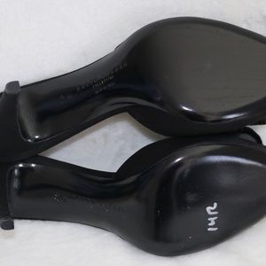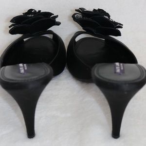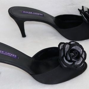 This is a Sexy stunning pair of Ralph Lauren Purple Label Black satin pumps with a Rhinestone flower and all leather sole Slide heels in a size 9 1/2 B. They are 100% Authentic and made in Italy.These stunning heels are New without the tags. They were never worn. They have small light Showroom marks on the back of one heel, see picture.(small) They have the Ralph Lauren name on the insole, and engraved on the leather sole. The soles have a few showroom scuffs, see pictures. Smoke-Free.