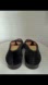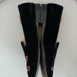 Elegant black velvet loafers featuring pink embroidered initials. Perfect for a stylish look.