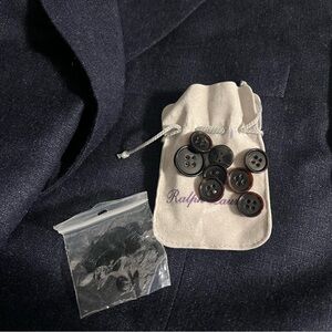 This is a Ralph Lauren Purple Label men’s navy blue wool, linen, and silk (tussah) blend sport coat/blazer. The blazer is a size 44R. It is in very good pre-owned condition. The “Made In Italy” tag has had some stitching come loose, as can be seen in some of the photos. It comes with thread and buttons, as can be seen in the last photo. It will be shipped safely within one business day of purchase. Feel free to ask any questions. Thanks!