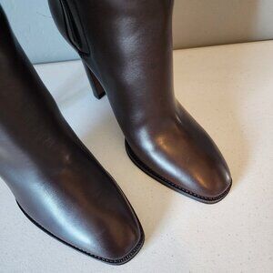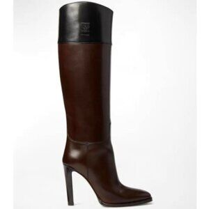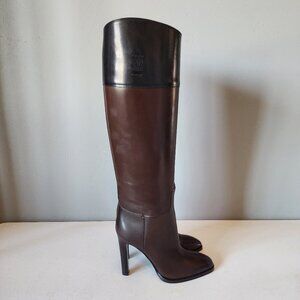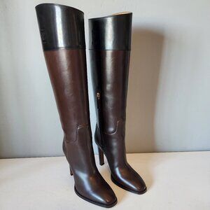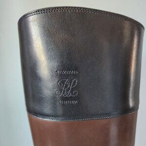 "NEW" Gorgeous Looking Reese Tall Boots By Ralph Lauren ( Purple Label ). Pull on Style with Inside 7" Ankle Zipper, Interior Top Loops/Pull, Squarish Toe, Dark Brown & Black Leather with Embroidered Initials Accent, All Leather Upper, lining & Soles, Stacked 4" Heel, High/Low Look, 15" Circumference at Top & 18" Tall from Arch, Made in Italy, New, Never Worn, Only Tried On, Minor Markings Normal Retail Environment & Stored:) Rt.1,500.00 approx. Size 39/ Chart 9, Foot Bed Measures approx. 10.1/4" for Reference. * Box is a Bit Beat Up, But All Stuffing & Box included. **Priced at 60% Off Retail.