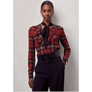 • Ralph Lauren Collection "Zandra" silk georgette blouse with a plaid print, ruffle front, and a contrast neck tie