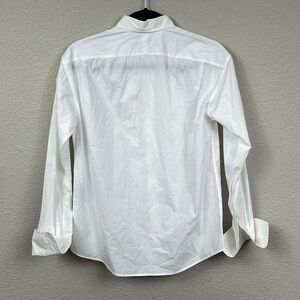 Preowned. Has some yellow staining on front and around collar. Interior staining on cuffs where they fold up. Requires cuff links