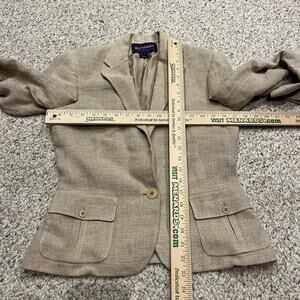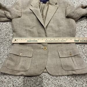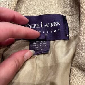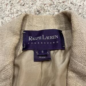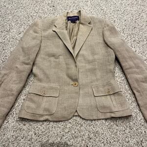 Elegant tan blazer with button closure. Features front pockets. Classic design by Ralph Lauren Purple Label.