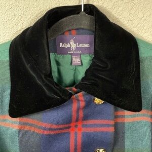 Shades of green, blue, and red tartan with gold tone buttons and black velvet collar. This cropped blazer is stunning! A little preppy, a little equestrian. 100% wool.