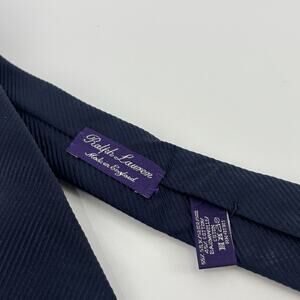 The product is a high-quality, handmade Ralph Lauren Purple Label silk tie in a solid navy blue color. Made in England, this designer accessory exudes luxury, formality, and elegance, making it perfect for weddings, business events, or formal occasions. With its vintage touch and premium material, this tie is a sophisticated addition to any man's wardrobe.