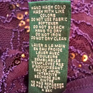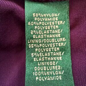 Beautiful deep purple Ralph Lauren monochromatic stretch dress with lace and sequins. 3/4 sleeve, knee length, cowl neck and ruching on left side. Excellent pre-loved condition.