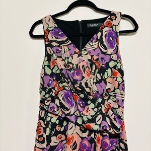 This stunning A-line dress by Ralph Lauren showcases a vibrant floral pattern in purple and pink hues, perfect for a wedding guest or cocktail event. The sleeveless design and v-neckline add a touch of elegance, while the midi length offers a classic and sophisticated silhouette.