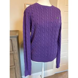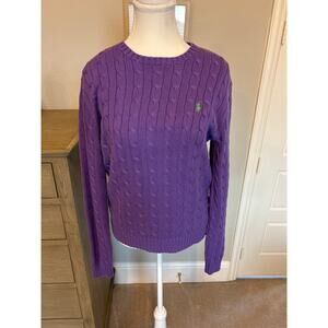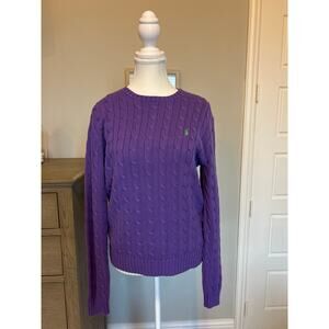 Elevate your style with this beautiful Ralph Lauren cable knit sweater. In very good condition, this purple sweater features a striking green logo, adding a touch of sophistication and charm. The long sleeves make it perfect for cooler days, offering both comfort and style. This XL size sweater is ready to become a cherished part of your wardrobe. Grab it now and add a pop of color and elegance to your outfits!