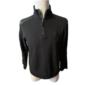 Ralph Lauren Quarter Zip Leather Shoulders Black Size Large Exaggerated Pony
