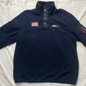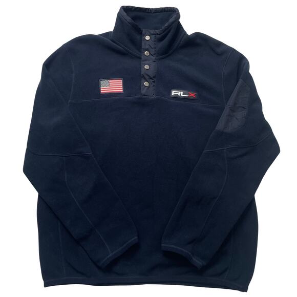 Ralph Lauren RLX navy blue fleece sweatshirt, size XL. Features a quarter button/ zip fleece pullover with an embroidered USA flag and one zippered pocket on the left arm sleeve. Good preowned condition, no notable flaws.