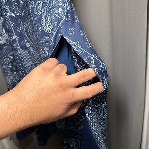 Elegant blue top with intricate white patterns. Perfect for casual outings.
