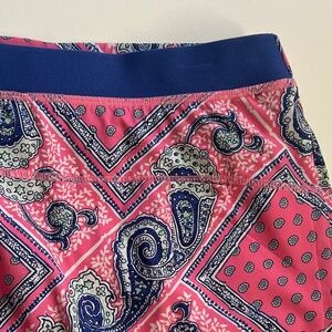 Pink, Royal Blue, White Paisley print with Royal Blue elastic back waist.
