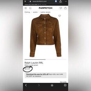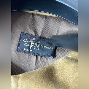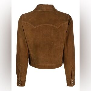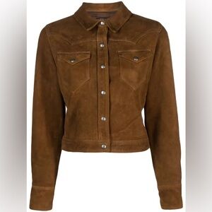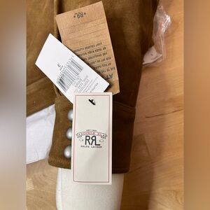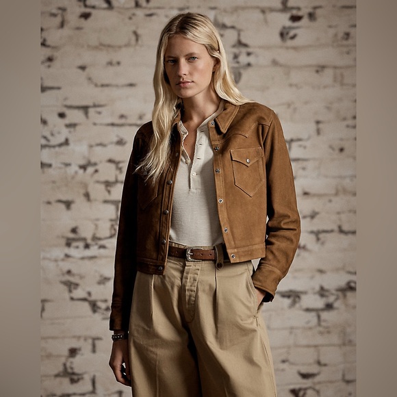 Stylish tan suede jacket by Ralph Lauren. Features classic jean jacket design. Perfect for versatile wear.
