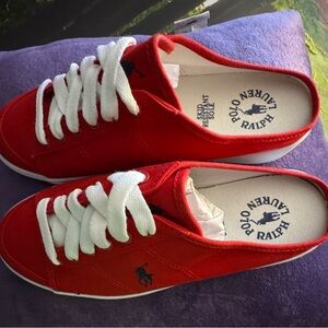 These Ralph Lauren sneakers boast a vibrant red canvas upper with a clean, classic low-top design. Featuring white laces threaded through metal eyelets and a contrasting white rubber sole, these sneakers offer a timeless look perfect for casual outings.