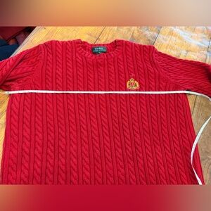 Classic red crewneck sweater. Cable knit design. Embroidered logo detail.