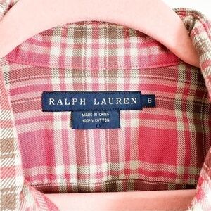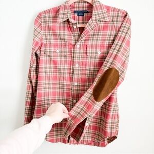 Ralph Lauren Red Green Plaid Button Down Shirt w Brown Suede Elbow Patches. Size 8, but rubs small and fits like a 4/6, which is the size I wear and it fits me great. Not meant to be oversized. Excellent condition. Not stretchy. Such a classic style that will never go out out of style.