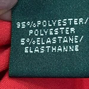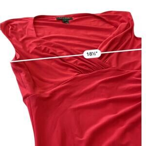 This stunning red dress by Ralph Lauren features a chic ruched surplice design with a flattering v-neckline and cap dolman sleeves. Perfect for a cocktail party or a night out, its sheath silhouette and midi length offer a sophisticated and elegant look. stretch fabric for comfort