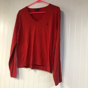 Elegant red pullover with V-neck design. Iconic Ralph Lauren style.
