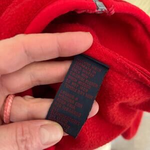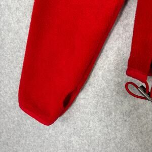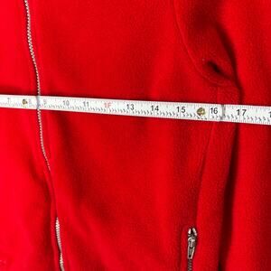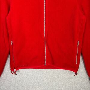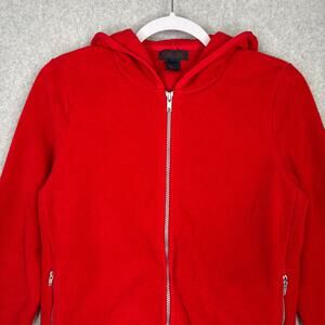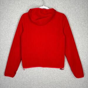 Vibrant red hoodie. Full zip closure. Adjustable drawstrings. Comfortable fit.