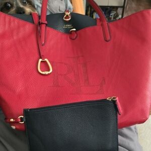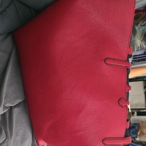 Chic red tote with black accents. Features gold hardware. Ideal for everyday use.