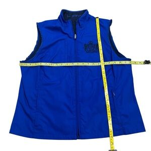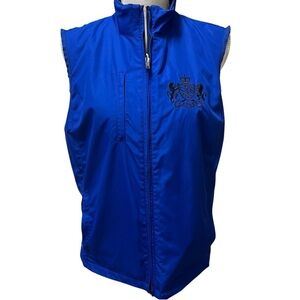 Ralph Lauren Reversible Crested Vest Blue Size Large *Has Flaws* Functional zippered pockets on both sides, crest is also on both sides. *Navy blue side of vest is in excellent condition, the royal blue side has stains on the back panel. They almost blend in but you can see them when the light is right. Please refer to last two pics.