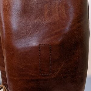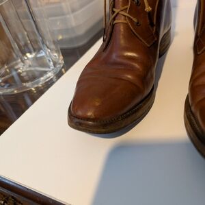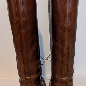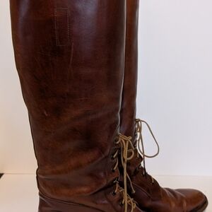 Gently worn Ralph Lauren Riding Boot, size 6 1/2. slight imperfection on the outside upper left boot. Missing aglet on the right boot lace and some scuff on the right boot toe.