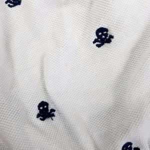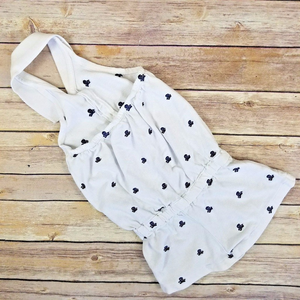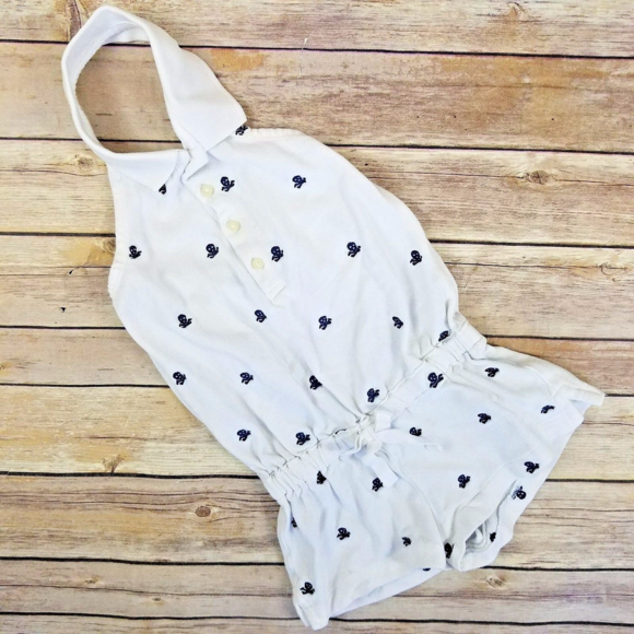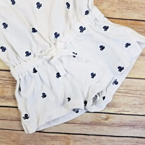 White halter romper with elastic tie waist featuring all over dark blue embroidered skulls. Retail $68.