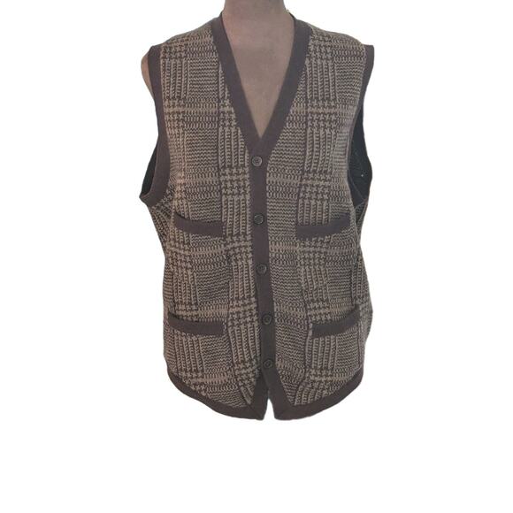 Authentic Ralph Lauren Rugby collection 100% lambswool sweater vest. Features a rich brown plaid knit pattern with subtle burgundy and forest green accents, classic button-front closure, and front patch pockets. A timeless piece perfect for layering in preppy, vintage, or grandpa core styles.