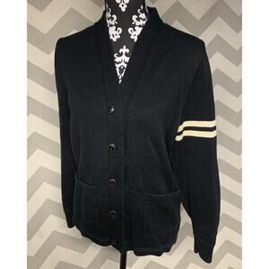 This is a preppy Ralph Lauren Rugby black sweater with a tight-knit style and long sleeves. It features a crew neck, button closure, and pockets. The sweater is made of cotton and wool, suitable for winter, fall, and spring. It is designed for men in size small, with a regular fit. The style is inspired by university and college fashion, perfect for casual, workwear, or business occasions.